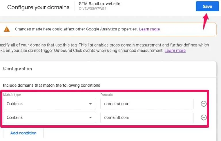 Step #5. To configure your tracked domains, click on Add condition in the Configure Your Domains section. Next, choose a match type for the domain conditions and enter the identifier for the domain you want to match in the Domain field (e.g., yourwebsite1.com)